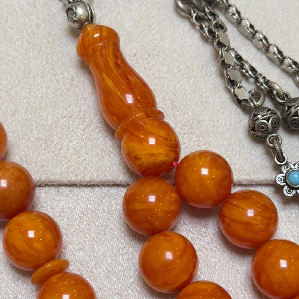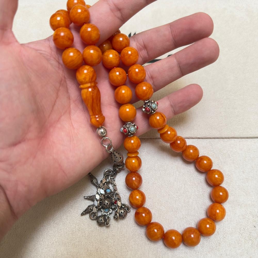 سبحة تشد الأنظار بلونها المشمشي الجميل مع تعريقات رائعة.مسباح صب جديد و صلب وثقيل وصوت رائع . خراطه تركيه مميزه و الفواصل من نفس الخام والكركوشه من ال...